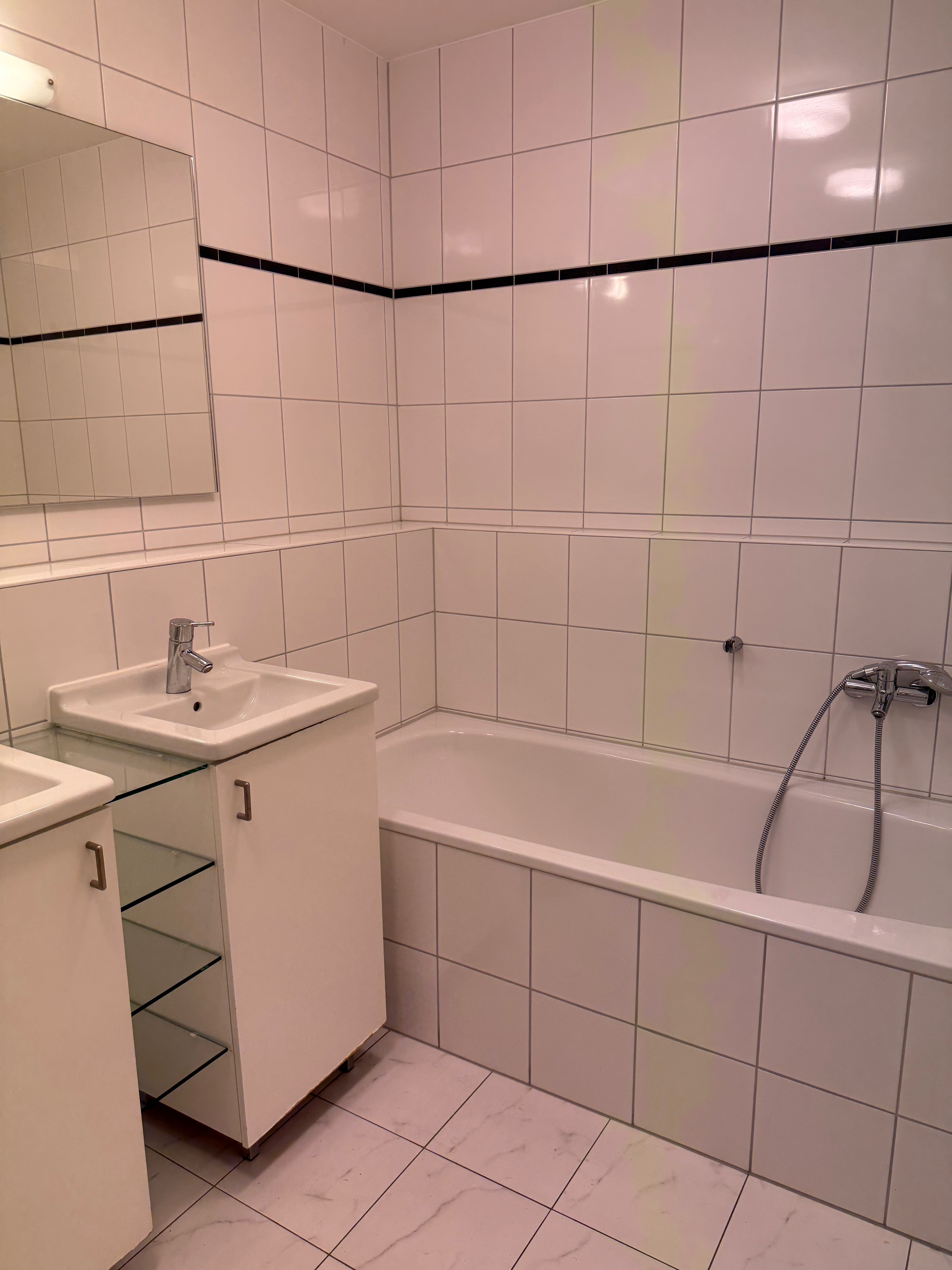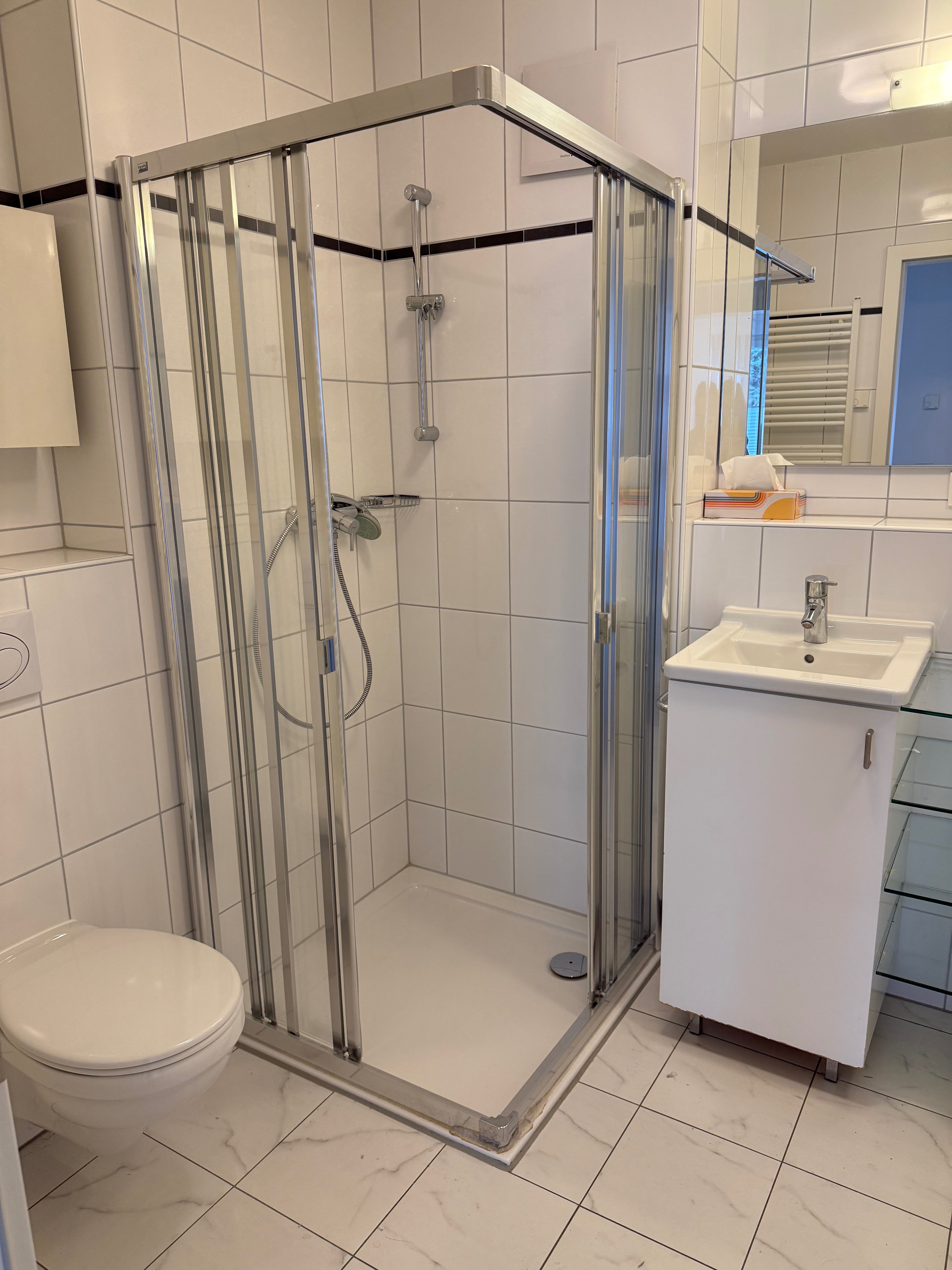 Das hochwertig ausgestattete, weiß geflieste Badezimmer bietet sowohl eine ebenerdige Dusche als auch eine Badewanne. Ein separates Gäste-WC sorgt für zusätzlichen Komfort.
